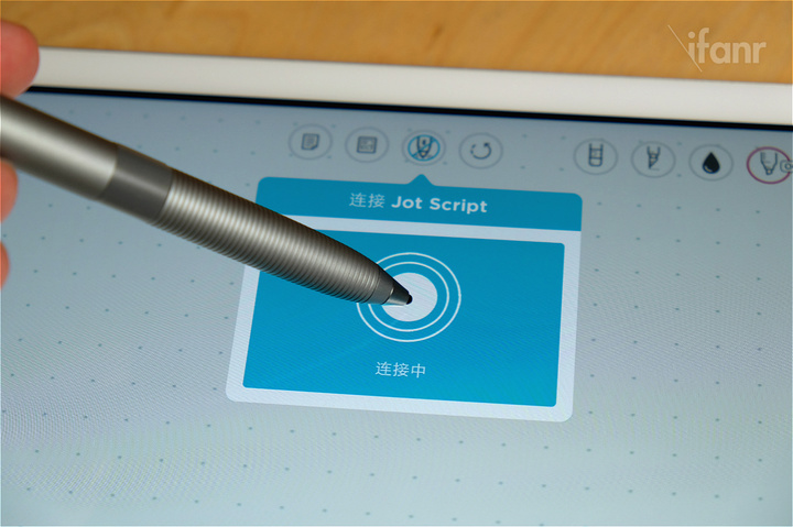 Jot Script 2 通过蓝牙连接设备,打开墨点,用笔尖点击配对区域,3 秒左右即可完成连接。印象笔记官方表示,Jot Script 2 支持手腕屏蔽,实际体验中,这个功能并不稳定,时长出现手腕影响书写的情况。