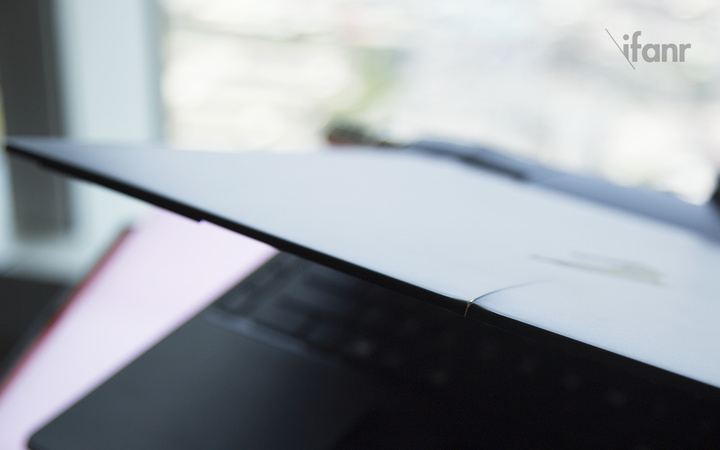 外观上和前作 X3、X7 一脉相承,你完全可以把它看作是放大版的 X3,或者是缩小版的 X7,屏幕为 15.6 英寸 WQHD+ 2880×1620。机身外壳为铝合金材质,类肤质磨砂涂层。平整的顶壳前端中间位置有一道凸起的脊线,让机身多了几分力量之美。类似的脊线在转轴附近也有出现。