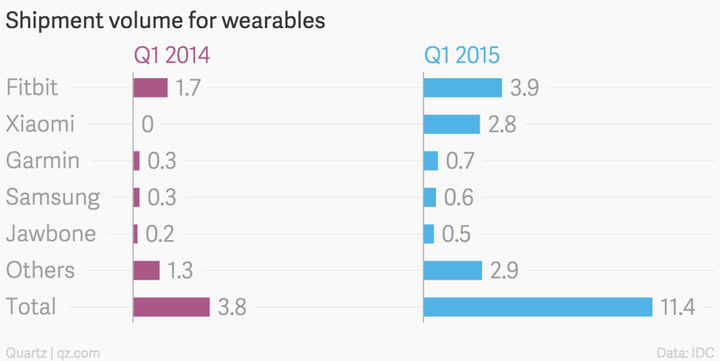 排名第一的则是在 2009 年便进入可穿戴领域的 Fitbit,第一季度的出货量为 390 万支。目前有多款产品在售卖,价格从 60~250 美元不等,而小米手环的售价则仅仅为 15 美元。