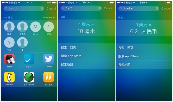 Proactive assistant 有两个唤出方式,一个方式是和 iOS 7 以后一样在主界面除顶部和底部之外的地方通过从上往下的手势唤出,这种情况下和上一个版本的全局搜索非常类似。另一个方式是和早期 iOS 唤出全局搜索的方式一样,在主界面一路滑动到最左方唤出。这种情况下会显示最近联系人和系统猜测你喜欢用的 app。