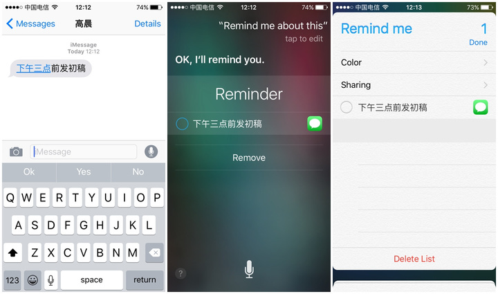 例如,当你看到短信中出现一些重要信息点,都能在信息界面唤出 Siri 为你提醒。而要说的不过是:“一会提醒我做/拿/看这个。” Siri 则会把这个加入你的待办事项中去。就像我们测试的这样: