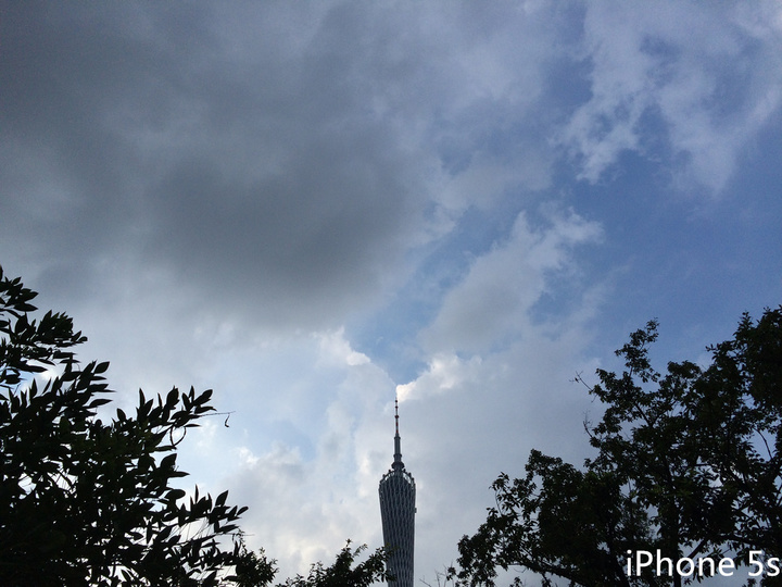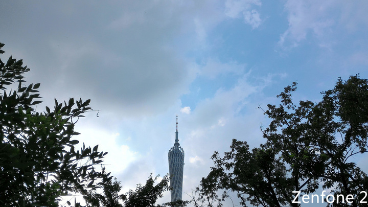 在同样开启了 HDR 模式之后,可以看见 Zenfone 2 的表现要更好一些,广州塔纹路和对比更为明显,树叶也能看出一些绿意,而 iPhone 的广州塔显得晦暗,树叶显示出来也是黑色。但是因为 HDR 的效果,Zenfone 2 天空中的乌云也显得明亮一些,不及 iPhone 的写实。