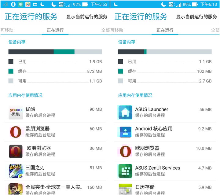 并且,由于 Android 的后台机制,而当后台程序占据太多内存时,比如占据了 1.5 GB 后,一些后台进程就会被“踢”掉。而在 2GB RAM 手机上,内存剩下不到 500 MB 是经常看到的事情,毕竟目前的系统资源占据得越来越多了。而这个不断“踢”掉的过程其实是耗电并占用 CPU 的。