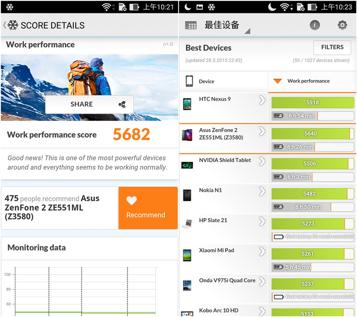 另外,另一款跑分软件 PCMark Android 版则给这款机器更高的评价,在所有 Android 设备,包括平板电脑中,Zenfone 2 的性能仅次于 Nexus 9,排在总榜第二,三星 S6 和小米 Note 顶配版都在其后。