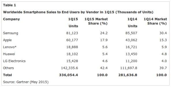 联想的情况比较特殊,Gartner 给出的一季度全球市场份额中,联想位居第三,这是收购 Moto 之后得到的成绩,前面三星和苹果一骑绝尘,但是后三名的份额十分接近,位于第四的华为份额为 5.4%,第五的 LG 份额为 4.6%。差距都在 1% 之内。如果从另一个方面比较的话,2014 年的联想份额还有 5.9%,那时 Moto 收购案还尚未完成,在收购的助力下,联想的总份额仍在后退,可见联想移动业务在这一年间无所事事到何种程度。