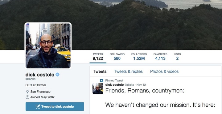 9. 在写这条推的时候,Dick Costolo 的 Twitter 上仍然挂着 Twitter CEO 的职位。