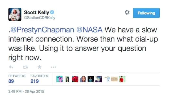 宇航员 Scott Kelly 今年 4 月在国际空间站发 Twitter 吐槽了一下太空网速。虽然抱怨网速有点慢, Scott Kelly 还是保持着我们更新朋友圈那样的频率发着 Twitter。最近的一条消息是 4 个小时前,Scott Kelly 跟同在太空的 Philae 打了个招呼说:“原来也有人和我一样醒着”。