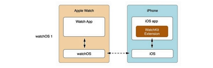苹果在官方网站阐述了原理:含有代码和源 (code and resources) 的 WatchKit 扩展并没有被放在 watchOS 1 的手表应用内,而是被放在了其相对应的 iOS 应用上,由 iPhone 运行后再将结果传输给 Apple Watch。