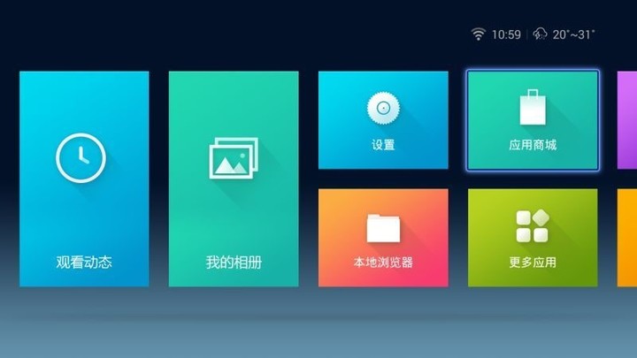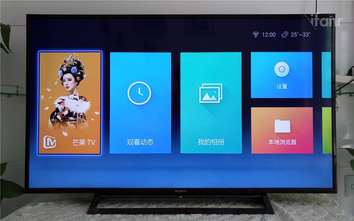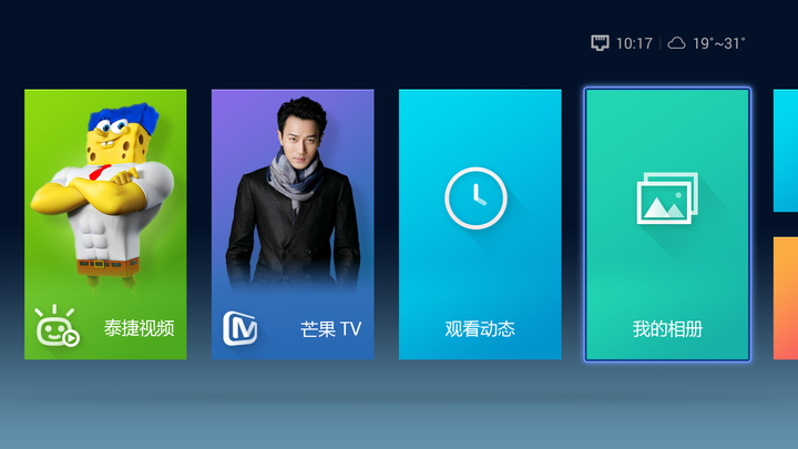 其系统的 UI 风格和市面上众多的同类产品相似,都脱胎于 Windows Phone 的 Modern 界面,比较容易理解且易于上手。其菜单包括芒果 TV 、观看动态、我的相册、设置、本地浏览器等。