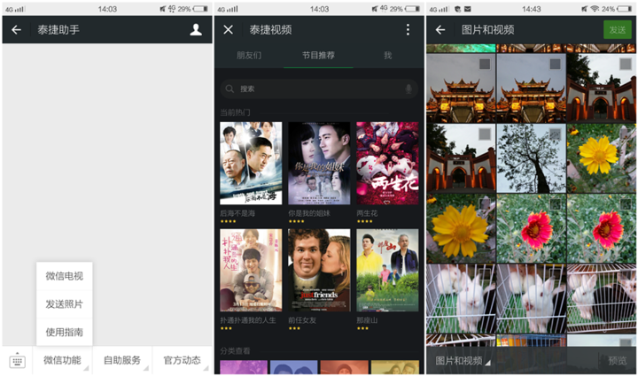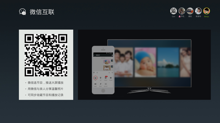 根据官方的演示,绑定微信之后,可以远程推送视频到家里的电视上帮助不会操作的老人观看,也可以把手机里的照片上传到电视与家人一起分享。