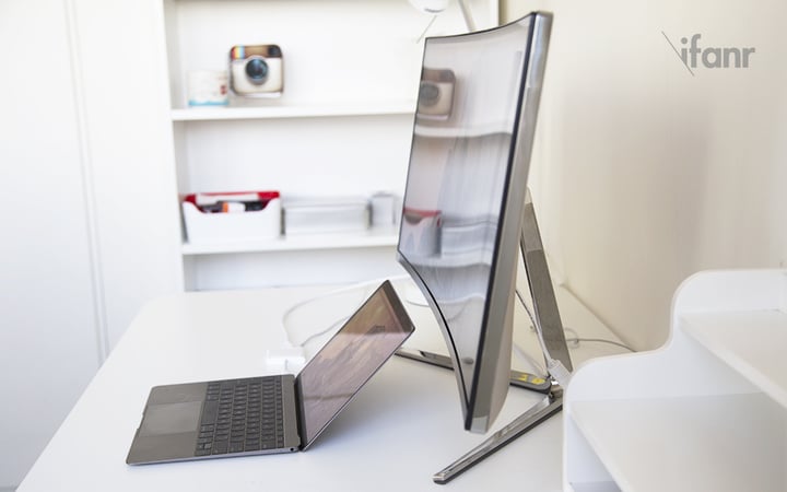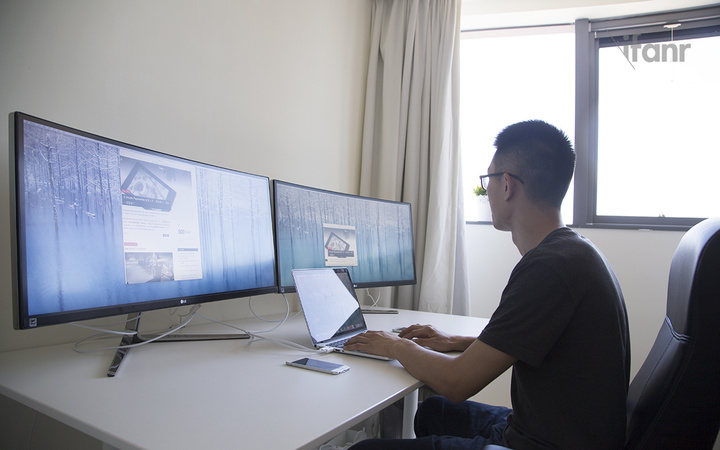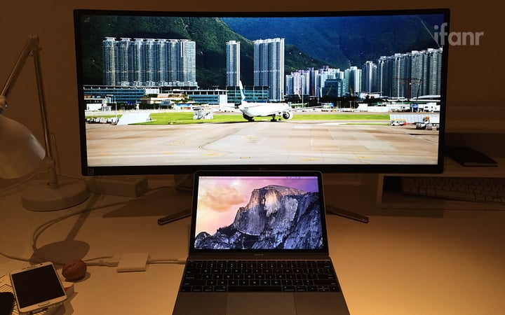 我工作用的主力机是 12 寸的 MacBook。以它的屏幕尺寸来看,浏览器打开多个页面,开启多个应用之后,桌面显示空间就会捉襟见肘了。在外接上这款曲面显示器之后就是另外一种完全不同的体验了,你会发现整个视野开阔了很多倍,原来的那种压迫感也不复存在。