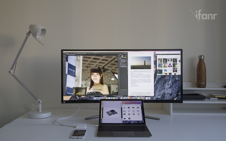 除了视觉上所感知到的变化外,更大的好处在于,多任务处理的效率提高了很多,并排排列三个窗口,在编辑文本时可以与参照资料对照来看,另外一部分空间还可以打开音乐,或者是 Photoshop,准备随时处理照片。