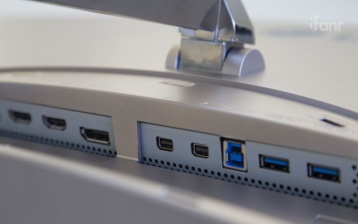 背面还有一块弧形盖板,用以遮挡线材和各式的接口,让桌面更加整洁。打开盖板之后则是一排阵容堪称豪华的端口,这应该是目前接触到的显示器中最为齐全的接口配置了(当然了,老旧的 VGA 和 DVI 接口并不在此列):