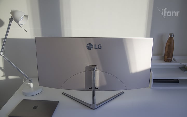 21:9 的比例使得这款显示器在视觉上有着很强的张力,再加上倒 V 型的细长脚座,整机多了几分灵动。正面是纯黑色的面板,底部边框上印有 LG 的 logo,低调而不张扬。