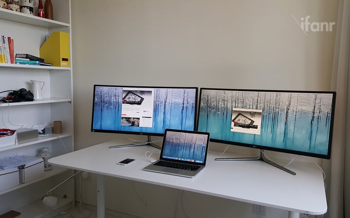 最后这部分呢,算是一个小小的福利吧。我们在前面讲到 LG 这款曲面显示器接口之丰富不由得一阵兴奋,因为这其中有两个雷电(Thunderbolt)接口,我们手边正好也有一台具有两个雷电接口的 2014 款 Retina MacBook Pro。这就意味着我们可以玩起来霸气侧漏的显示器串联,或者并联。于是就出现了下面这样一个场景(请自动忽视两台显示器显示效果上的差异,右边一台未经校色):