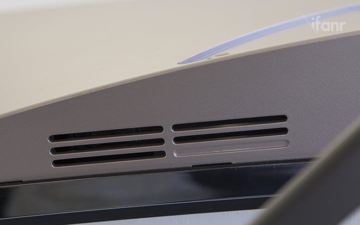 机身底部还有两枚扬声器,扬声器的开槽兼具散热的功能。音响的功率为 7W,支持 MaxxAudio 技术,声音浑厚,并且可以根据自己的喜好调节低频音量等参数,足以应付日常的影音娱乐需求。