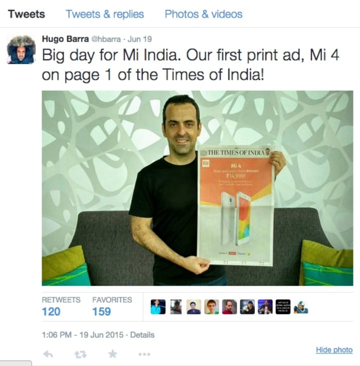 继 4 月底,雷军在小米 Mi4i 印度专场发布会上用“Are you OK?”问候印度“Mi Fans”之后,最近小米又在印度开启新一轮宣传攻势,这一次他们没有选择惯用的网络营销手段,反而是买了 6 家报纸的广告版面,日前 Hugo Barra 还在 Twiiter 上展示了他们在《印度时报》上的整版广告。