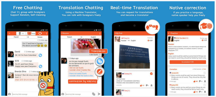 LeXchat 直接把交朋友和通过聊天来锻炼外语并列为应用说明。Anytalk 拥有比较复杂的功能,应用与其说是在强调和别国人社交可能收获的语言能力,不如说是突出翻译设计,包括聊天时的机器翻译和母语者帮助练习两种。 其中让母语用户修正别人的语言错误这点很像 Stack Overflow 的奖励机制。而 divercity 虽然之前一直以语言交流为卖点,在会场上却开始强调其作为不同国籍用户社交平台的性质。