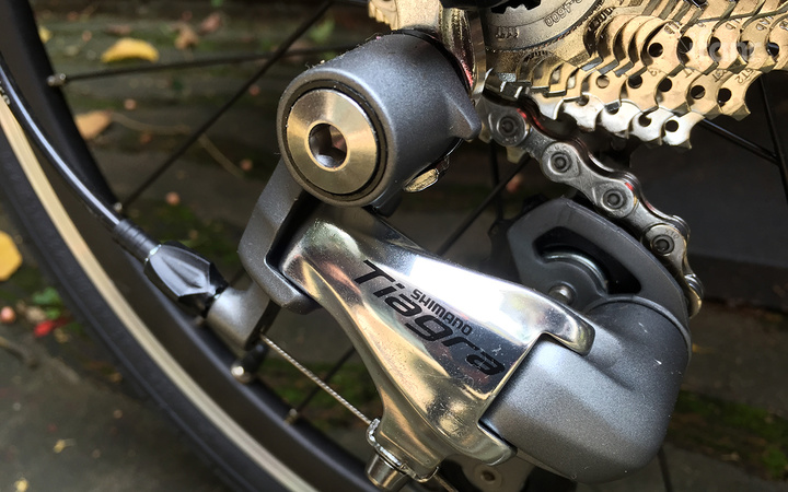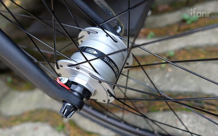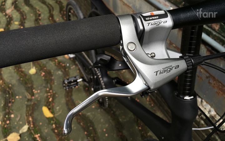 我们这次拿到的是基本款,花鼓、飞轮在内的传动组件都是禧玛诺(Shimano)的 Tiagra 系列,虽然不是专业级别,但在禧玛诺的业余级产品线上已经是最高阶了。根据我的骑行体验来看,表现非常赞。尤其是我这种骑多了杂牌山地车的人,骑了一次启孜就开始有种回不去的感觉了。