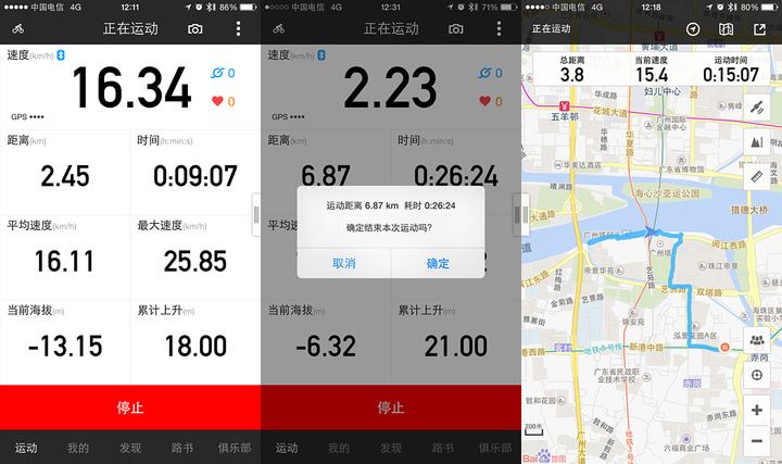 应用的界面大部分都沿用了行者的设计风格。对骑行距离、速度等测试在你开始骑行的时候就会开始显示数据,其实不用连接到单车,单单用手机的 GPS 定位就可以实现。不过启孜连上手机后,会通过车内的 GPS 绘制的轨迹,并且同步到手机,绘制出下面这张图的轨迹。