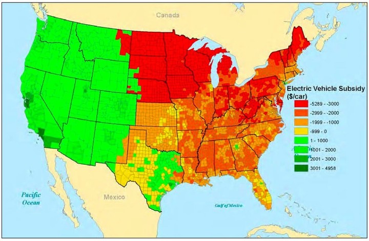 从上图能看出,美国各地电动车与汽油车的环境成本分布,总体而言西部比东部环保,乡村比城市环保。据此,研究者提议根据这种成本分布制定公共政策,对不同地区的电动车给予相应的补贴/征税。