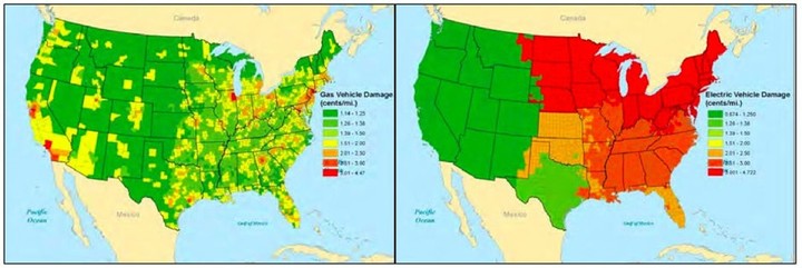 汽油车的排放非常容易监测,通过综合考虑油耗、污染物弥散程度、污染的影响等等因素,计算成在某地开某车的每英里排放。左图数据采集自烧油的福克斯,高污染出现在人口密集的城市,红色区域为 5 美分每英里,绿色的区域为 1 美分每英里,总体上分布比较均匀。