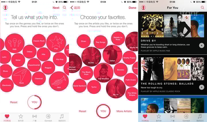 我们一项一项来看。首先是“为您臻选”,这个功能其实正是源于之前的 Beats Music,你可以选择自己喜欢的音乐流派和艺人,苹果就会根据你的选择帮你创建一连串的歌单。