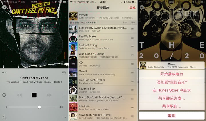 第三项是广播,其实就是 iOS 7 上就有的 iTunes Radio。新加入了来自 Beats 的号称永远在线的 Beats 1 电台,有 DJ 主持,在歌曲之间进行串场。一点开就听到上次在 WWDC 发布会上演唱的 The Weeknd 的歌。