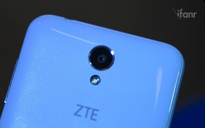 机身外壳主要是塑料材质,并没有什么分量,5.0 英寸 720p 的屏幕,可以轻松地单手握持。背后上方是 1300 万像素的后置摄像头,之后是闪光灯和中兴的 ZTE logo。最下方是对称分布的外放喇叭,但不要指望它配备的是双扬声器。