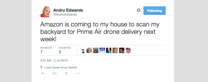 一位名为 Andru Edwards 的西雅图居民在自己的 Twitter 页面上开心地说:“下个星期亚马逊就要为无人机送货勘测我家后院了!”言语中似乎带着兴奋。但亚马逊官方和 Andru Edward 本人面对福布斯的询问时都拒绝评论,而在那之后不久, Andru Edwards 删除了这条推文。