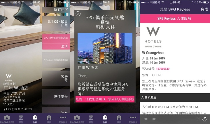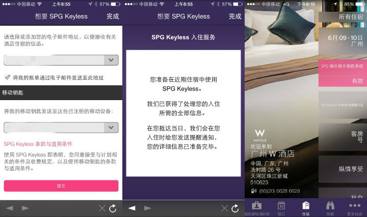 这是喜达屋集团去年年底推出的“无匙入住”服务,根据喜达屋的介绍,在 SPG 应用中注册预定好房间后,提前办理“无匙入住”,到达酒店时便无需再去前台 check in,直接用手机就能打开房门。