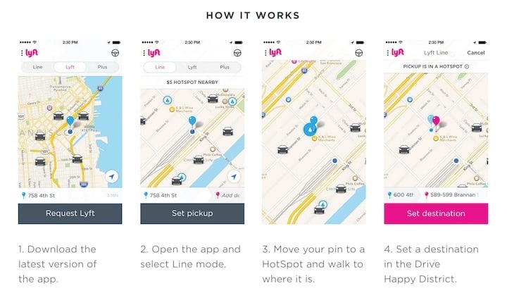 TechCrunch 的报道提到,这些热点综合考虑了安全、便利、效率等几个要素,主要设在有停车空间、朝向热门目的地、方便掉头的地方。使用的时候,只要打开 Lyft 的拼车模式 Lyft Line,然后把自己的位置图钉拉到附近热点上,系统就会为附近的司机选择一条最优的到达路径。