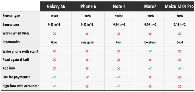 首先是一个整体的对比,最左列从上往下的对比项分别是:传感器类型、传感器大小、手湿情况下的表现、人体工程学设计、是否支持指纹识别亮屏、失败后是否支持再次识别、App 锁定、是否可以用于移动支付、是否可用于登陆网络账号。