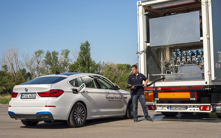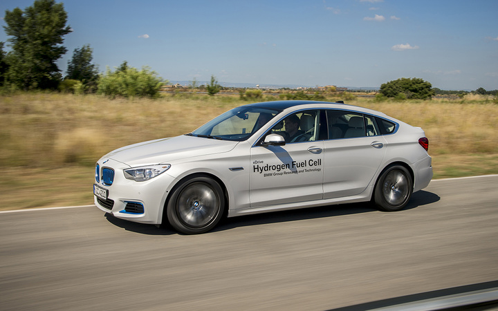 宝马最新公布的氢燃料电池版 5 系 GT 搭载的是电动机最大输出功率为 245马力(180kW),氢燃料罐放置在前后桥之间,一次燃料加注时间在 5 分钟,最大续航里程超过 500km。