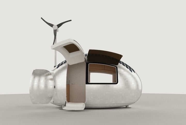 据 CNN 报道,斯洛伐克 Nice Architects 设计的 Ecocapsule 胶囊房屋兼具丰富的功能和漂亮的外观,可谓是超现实主义的人类住宅。这座房子内部面积虽只有 8 平方米,折叠床铺、书桌(可扩展为餐桌)、储物间、浴室和厨房一应俱全。房屋的外部则被充分运用于发电,屋顶上铺满了太阳能电池板,另外还有一个 750 瓦的风力发电机。风叶的弧形设计不但能高效带动发电机还能收集雨水,雨水从叶片中流经滤装置后可供人饮用。