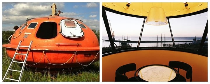 荷兰的胶囊酒店像是一个橙色的飞碟,改造自海上钻油平台的救生船,直径约 4.25 平方米。