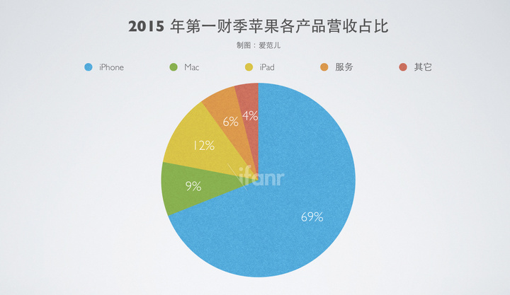 而去年 iPhone 6 和 iPhone 6 Plus 发布之后,苹果更是创下了单一季度售出约 7500 万台 iPhone 的记录。从最近两份财报来看,苹果通过销售 iPhone 所取得收入已经占其总收入的约 70%。想当年 iPod 顶峰的时候,其销售收入不过是占了苹果总收入的 48% 而已。