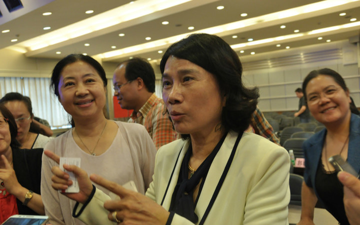 7 月 17 日下午,格力董明珠在《科技创新大讲堂》发表演讲。演讲中,她一改往日论调,称格力手机年内卖 5000 万台不现实。图为演讲结束后,董明珠与现场听众进行交流互动(via 中国科技网)。