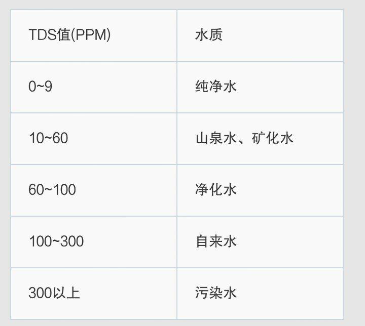 知乎上有用户贴出了一张图片,上面展示了常见水的 TDS 值,最后一栏 300 以上为污染水还有待商榷,因为常见的说法是国家卫生部给出的标准是 TDS 1000 以下的水都是合格的: