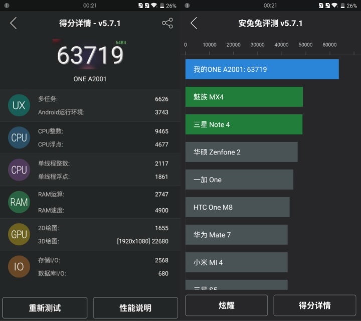 从上方跑分成绩图我们可以看到,代号为 One A2001 的安兔兔跑分为 63719,不仅远超 M9,小米 Note顶配版、乐视1 Pro 的 5.7 万分左右也被一加手机 2 甩在了后面。