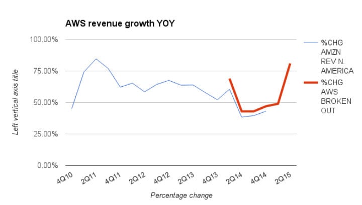 在亚马逊所有的业务中,表现最突出的当属 AWS(Amazon Web Services,亚马逊云服务,提供云计算与数据存储功能)。上个季度就表现不俗——营收近 15.7 亿美元,在这一季度中,它又创造了 18.2 亿的营收,同比增长 81%。
