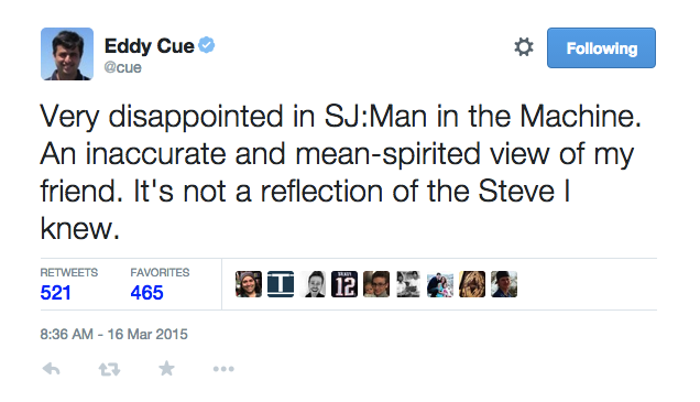 苹果高级副总裁 Eddy Cue 更在自己的 Twitter 上丝毫不掩饰他对此片的失望,直称这部电影描述失实,刻画出来的并不是他所认识的乔布斯的形象。