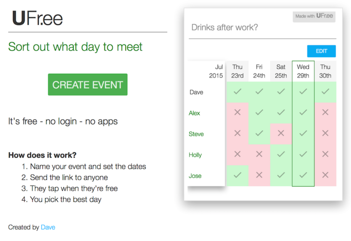 它的使用简单到不行。打开 UFree? 的网址,无需注册,标记好自己的闲时忙时,然后把网址复制到参加活动的人,让他们也标记自己的时间就可以了。