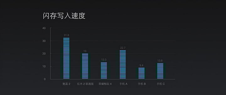 2GB 内存之外,魅蓝 2 还是用了 16GB 的 eMMC 5.0 高速闪存,这里躺枪的还是红米荣耀等友商机型,白永祥表示他们的闪存传输速度可以是友商的 1.5 倍以上。