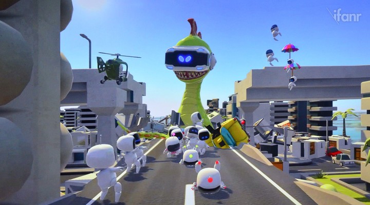 Morpheus 头盔会将玩家头部的运动数据输入游戏,怪兽要尽可能地用头部去撞击城市的高楼大厦。拿 DualShock 手柄的玩家则是城市中的居民,它们的身形相较于“怪兽”要小得多。居民的任务是保卫城市,向怪兽投掷杂物或者烟火什么的。现场有一大一小两个显示屏,大显示屏视角固定在怪兽的对面,小显示屏是怪兽的主观视角。