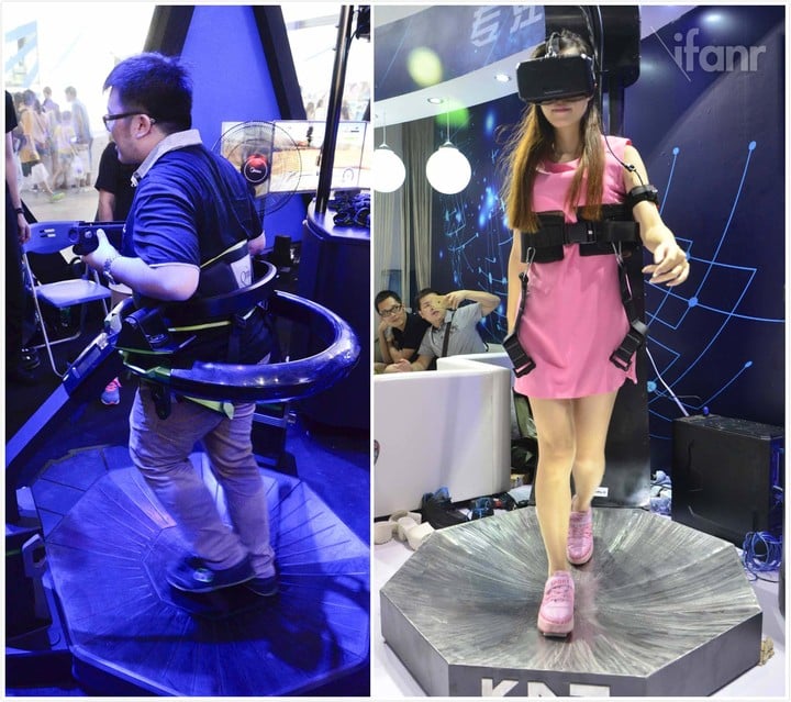 事实上,脚部动作输入的解决方案现在更加主流的并不是自行车,而是 ODT(Omni Directional Treadmill,全方位跑步机)。在 87870 展区,有首次来华的 Virtuix Omni。而在超凡视幻展区,则有最近在虚拟现实圈风头正猛、由国内团队打造的 KAT WALK,两者主要的共同点是: