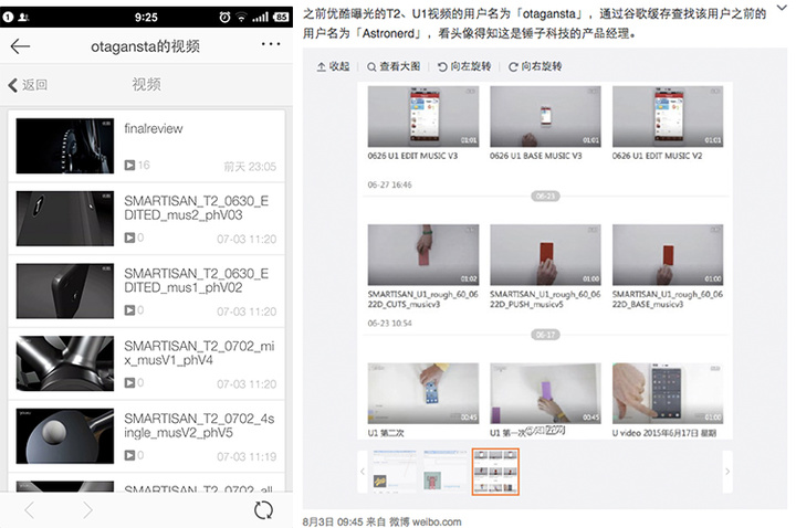 在上个月的早些时候,优酷上也有一位名为 Otagansta 的优酷用户先后上传了多个高清加密视频(目前已经被删除),并命名为 Smartisan T2 与 Smartisan U1。微博用户@知匠网则推测这个优酷用户实为锤子科技员工。