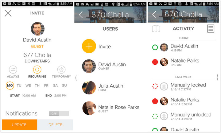 用户可以建立一个朋友列表,事先将虚拟密钥分享给列表中的朋友。这个列表中的朋友只要拿着分享了密钥的手机来到你的门前,房门就会自动打开。朋友进入之后房门自动关闭。用户可以指定哪位朋友在多长时间内拥有你家的虚拟密钥,也可以随时终止分享出去的密钥。朋友进出你家门的记录全都会出现在 app 里面。