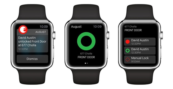 iOS 端用户更新了 app 后,不仅可以通过 Apple Watch 来锁门和开门,还能在手表上接收 August 智能门锁状态的通知信息,以及查看门锁的活动日志。目前 August 还不能像在手机上那样,让用户和拥有 Apple Watch 的朋友们共享虚拟密钥。