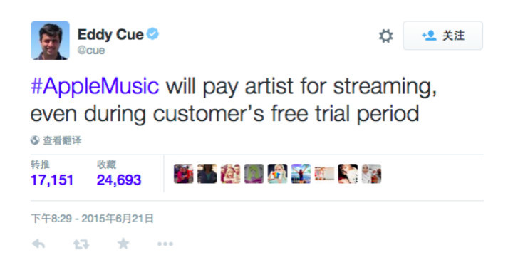 同样是遭受抵制,Spotify 采取的是煽情策略,苹果则略带妥协意味,Eddy Cue(苹果高级副总裁)在 Twitter 上对此给出的正面回应是,“别担心,就算是试用,你们也能拿到钱”。